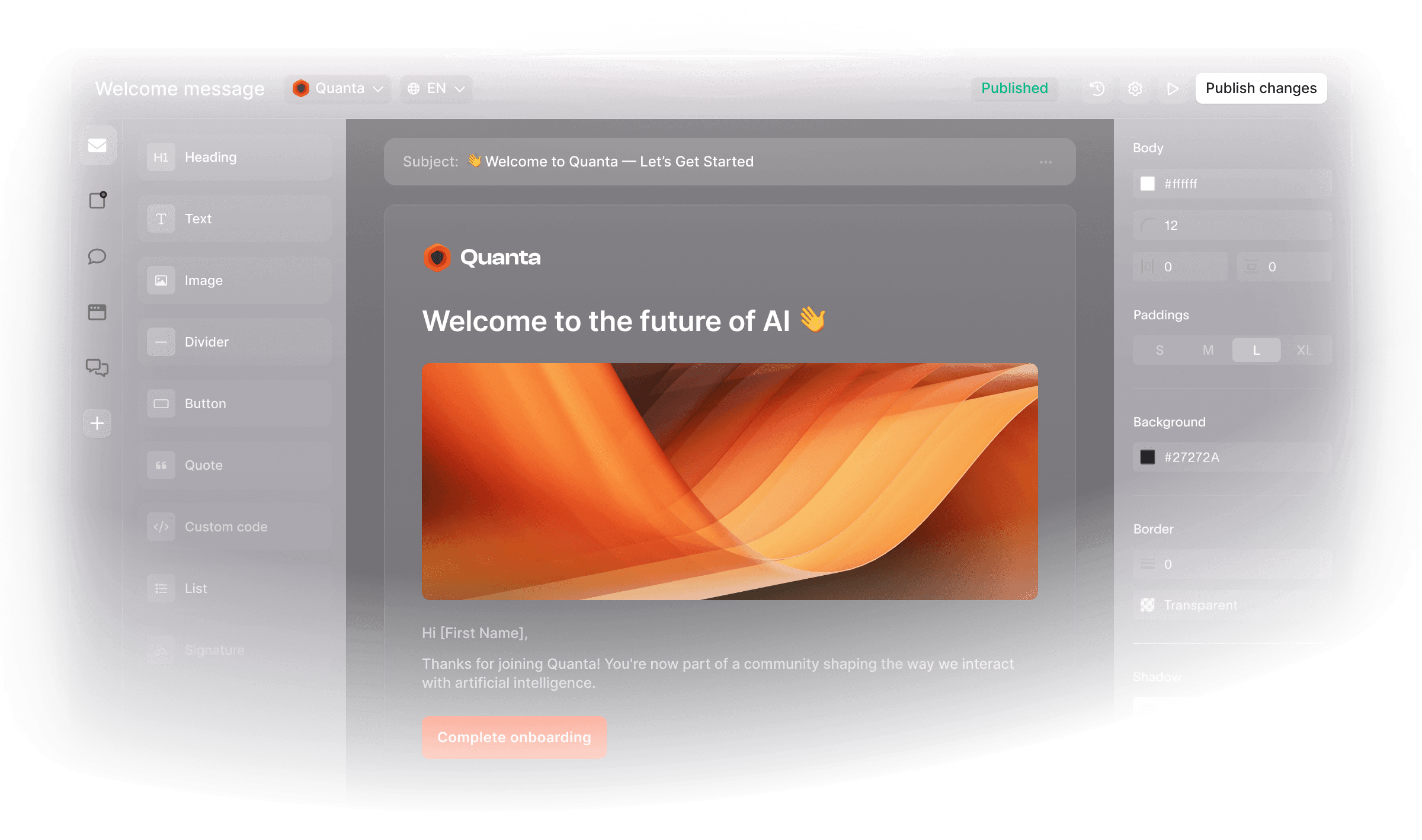 Courier's template designer makes it easy for anyone to update and edit notification content and design. Simply drag and drop your content blocks, then publish. No need to redeploy code.