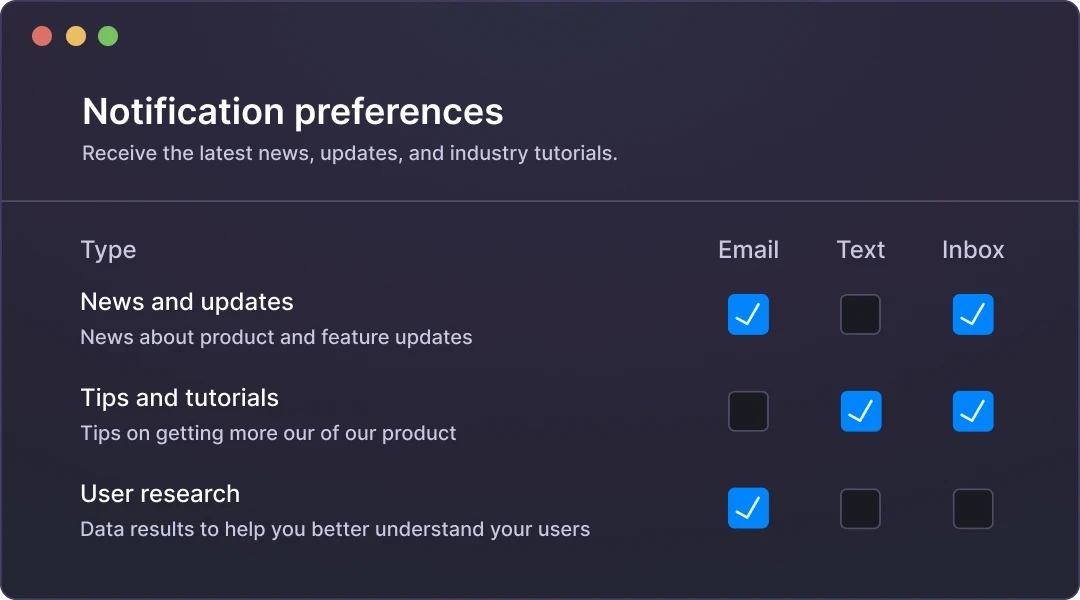 Give every customer a fully branded notification experience inside your app. Our embeddable designer lets your customers create and manage their own messages—securely scoped, beautifully styled, and powered by Courier’s delivery engine across all channels.